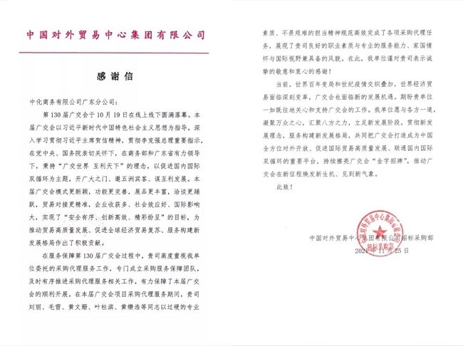 (感謝信內(nèi)容摘要):在服務(wù)保障第130屆廣交會過程中,貴司高度重視我單位委托的采購代理服務(wù)工作,專門成立采購服務(wù)保障團(tuán)隊,及時有序推進(jìn)采購代理服務(wù)工作,有力保障了本屆廣交會的順利開展。貴司團(tuán)隊以過硬的專業(yè)素質(zhì),不畏艱難的擔(dān)當(dāng)精神規(guī)范高效完成了各項采購代理任務(wù),展現(xiàn)了貴司良好的職業(yè)素質(zhì)與專業(yè)的服務(wù)能力、家國情懷與國際視野兼具的風(fēng)貌。在此,我單位謹(jǐn)對貴司表示誠摯的敬意和衷心的感謝!