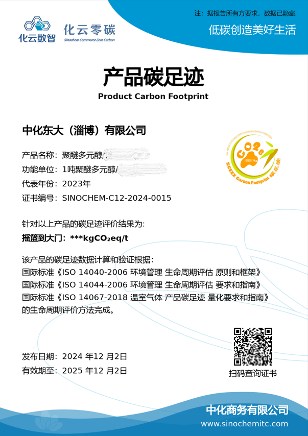 近日,中化商務(wù)有限公司(以下簡稱“中化商務(wù)”)圓滿完成對中化東大(淄博)有限公司(以下簡稱“中化東大”)兩款聚醚多元醇產(chǎn)品的碳足跡評價工作,有效確保中化東大產(chǎn)品滿足出口市場對碳足跡核算的要求,標(biāo)志著中化商務(wù)在推動綠色低碳轉(zhuǎn)型、助力企業(yè)實(shí)現(xiàn)可持續(xù)發(fā)展方面取得又一重要成果。